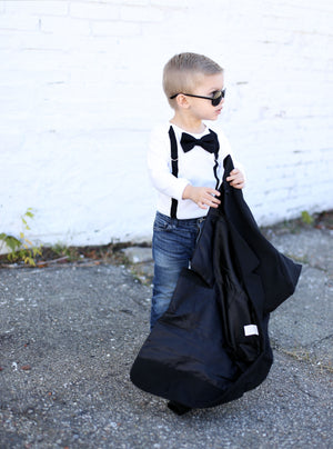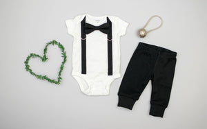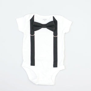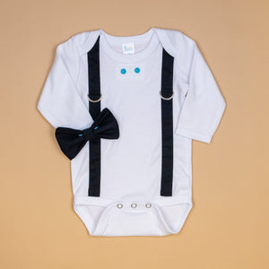 This bodysuit includes stitched on BLACK suspenders and a snap-on SOLID BLACK bowtie.