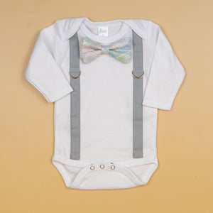 This bodysuit includes stitched on LIGHT GRAY suspenders and a snap-on SPRING PLAID bowtie.