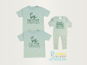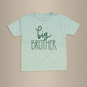 This heathered sage tee features “big brother” in dark green handwritten-style lettering. The cotton/poly blend makes it soft and slightly thicker than a standard tee—perfect for photos, play, or visits to meet the new baby.