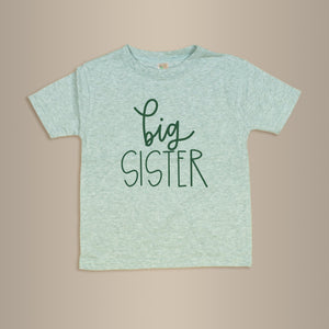 This heathered sage tee features “big sister” in dark green handwritten-style lettering. The cotton/poly blend gives it a soft, upgraded feel that’s extra comfy for big sibling duties.