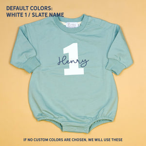 Customize it with your choice of blue-green, cream, heather gray, or pink romper colors. Add a #1 or candle and personalize with your baby's name—all in the colors of your choosing.
