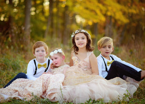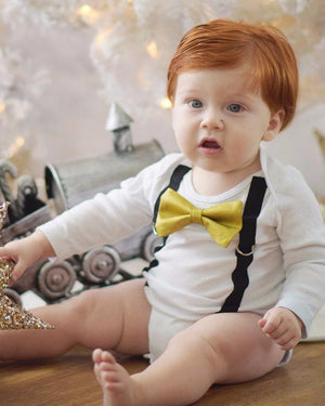 This outfit includes BLACK suspenders and a METALLIC GOLD bowtie.