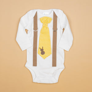 Includes a bodysuit (short or long sleeve), with mocha suspenders, and a snap=on yellow gingham necktie with added bunny.