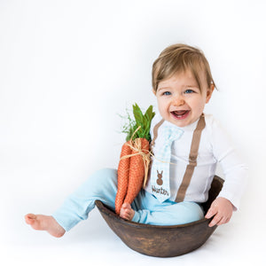 This includes a onesie or tshirt with mocha suspenders and a snap-on tie with your baby's name and a bunny on it.