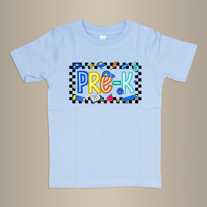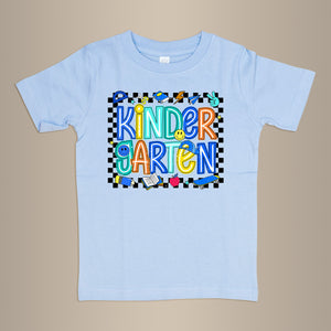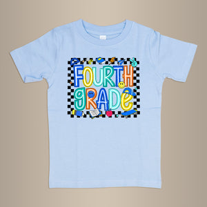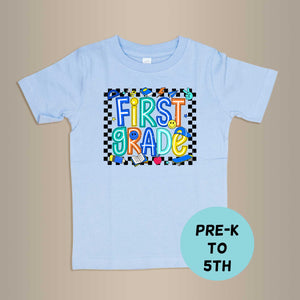 Mark the milestone in style with this bold and playful school tee! Featuring colorful hand-drawn letters inside a checkered frame, this light blue shirt is perfect for first day pics, meet-the-teacher night, or any day they want to show off their grade with pride.