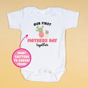 Bodysuit says "our first Mother's Day together" and features your choice of cute-styled silly critter in the middle of it. Critter options include avocados, planets, octopi, and more.