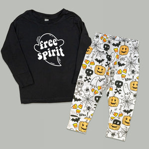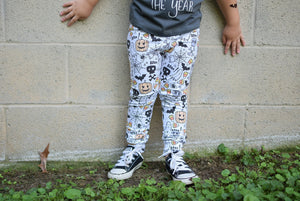 The matching pants are handmade in the USA by our team, with a playful Halloween print full of candy corn, pumpkins, ghosts, and spiders.
