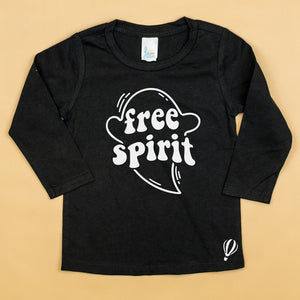 The black tee features our exclusive ghost “free spirit” design, professionally screenprinted with a raised ink that feels as good as it looks.