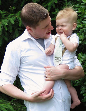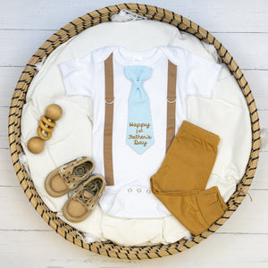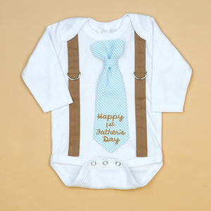 This bodysuit includes stitched on MOCHA BROWN suspenders and a snap-on BLUE SEERSUCKER necktie with your choice of phrase on it.