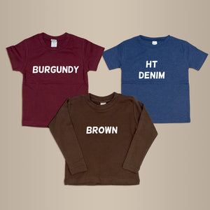 Available in fall-friendly Brown, Heathered Denim, and Burgundy, these tees are ready for everything from sticky fingers to mashed-potato-only diets.