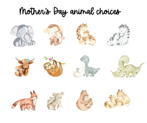 Printed with "our first mother's day together" and the customize it by adding Mom and Baby's names. Choose from 12 adorable graphics of cuddling mom and baby animals, including sweet elephants, dinosaurs, highland cows, and bears.