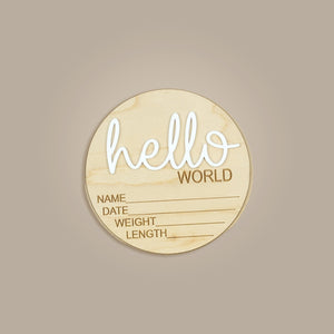 This 4-piece bundle includes a soft pastel blue romper with “hello world” printed in white, a handmade white knot hat, and a wooden “hello world” birth announcement sign to fill in baby’s name and stats. It all comes tucked inside a reusable muslin gift bag, ready to gift.