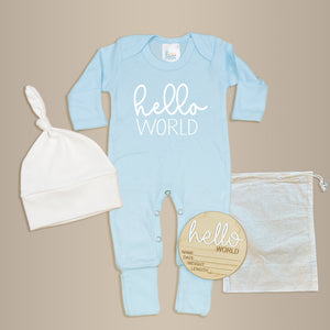 Welcome a sweet baby boy with our Hello World | Blue Gift Bundle — a thoughtful gift set for baby showers, hospital visits, or first photos.