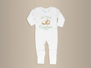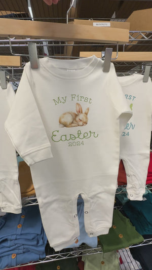 This white romper features our exclusive design: a sweet sleeping bunny with the words "My First Easter 2025" in sage green.