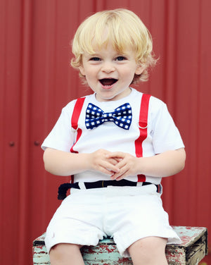 • Onesie or tshirt with red or navy suspenders and snaps for the tie