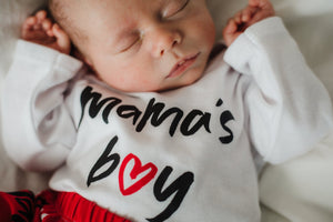 This bundle includes a soft long‑sleeve bodysuit printed with our handwritten “Mama’s Boy” design, applied with a professional screenprint transfer for a nice texture and lasting print. It pairs with handmade pants sewn by our team in the USA using custom, digitally printed fabric.