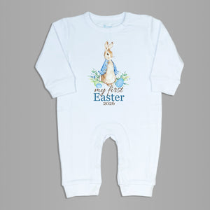 This white romper features a charming cottontail rabbit nestled among greenery and eggs, with the writing "My First Easter 2026" in blue and brown.