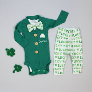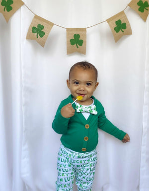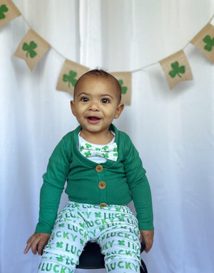 Celebrate his first St. Patrick's Day with our classic Green Cardigan set!