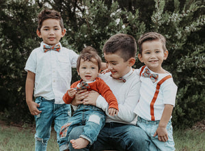 This outfit includes BURNT ORANGE suspenders and an ORANGE & CREAM PLAID bow tie.