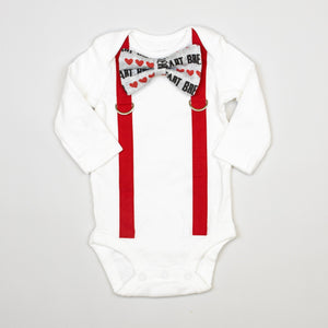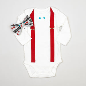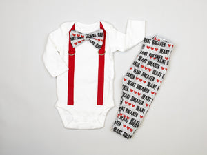 This includes a onesie with red suspenders and a snap-on heartbreaker bowtie.