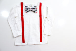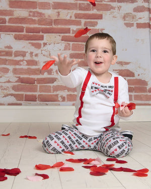 Doesn't this monochrome hugs & kisses fabric just pop amazingly with the red suspenders? You can get this tie and suspender outfit on a bodysuit or tshirt.
