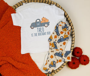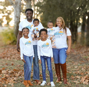 Is your little one celebrating their first birthday this fall? Personalize a pumpkin truck tee, and the whole family can match!