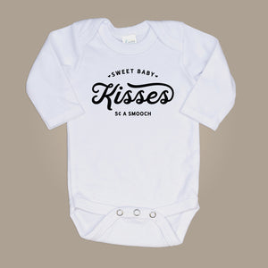 Wrap your little one in love with our Sweet Baby Kisses onesie. Made from a super soft cotton/poly blend, this onesie is perfect for your baby to wear on Valentine's Day. The adorable design of "Sweet baby kisses, 5 cents a smooch" is perfect for showering your little sweetheart with love.