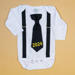 Get your baby boy ready for a party with a dapper tie outfit for the new year. The glitter year is permanently added to the black tie (don't worry, it doesn't leak glitter everywhere!)